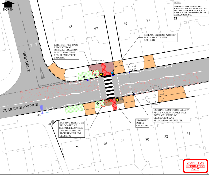Feedback from a number of residents, about an improved road crossing, followed up with site visits and observations have prompted us to propose a Zebra crossing to give residents a formal crossing point on Clarence Avenue.